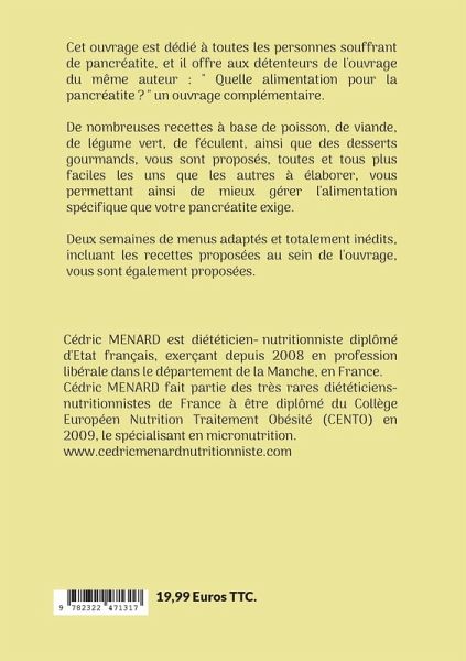 Cet ouvrage est dédié à toutes les personnes souffrant de pancréatite, et il offre aux détenteurs de l'ouvrage du même auteur : " Quelle alimentation pour la pancréatite ? " un ouvrage complémentaire.De nombreuses recettes à base de poisson, de viande, de légume vert, de féculent, ainsi que des desserts gourmands, vous sont proposés, toutes et tous plus faciles les uns que les autres à élaborer, vous permettant ainsi de mieux gérer l'alimentation spécifique que votre pancréatite exige.Deux semaines de menus adaptés et totalement inédits, incluant les recettes proposées au sein de l'ouvrage, vous sont également proposées.