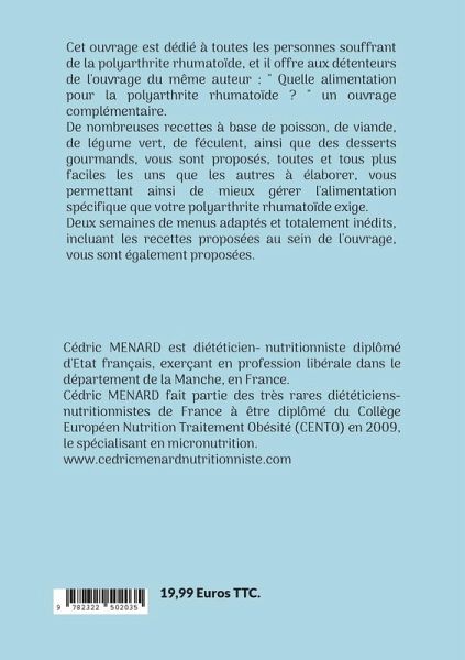 Cet ouvrage est dédié à toutes les personnes souffrant de la polyarthrite rhumatoïde, et il offre aux détenteurs de l'ouvrage du même auteur : " Quelle alimentation pour la polyarthrite rhumatoïde ? " un ouvrage complémentaire.De nombreuses recettes à base de poisson, de viande, de légume vert, de féculent, ainsi que des desserts gourmands, vous sont proposés, toutes et tous plus faciles les uns que les autres à élaborer, vous permettant ainsi de mieux gérer l'alimentation spécifique que votre polyarthrite rhumatoïde exige.Deux semaines de menus adaptés et totalement inédits, incluant les recettes proposées au sein de l'ouvrage, vous sont également proposées.