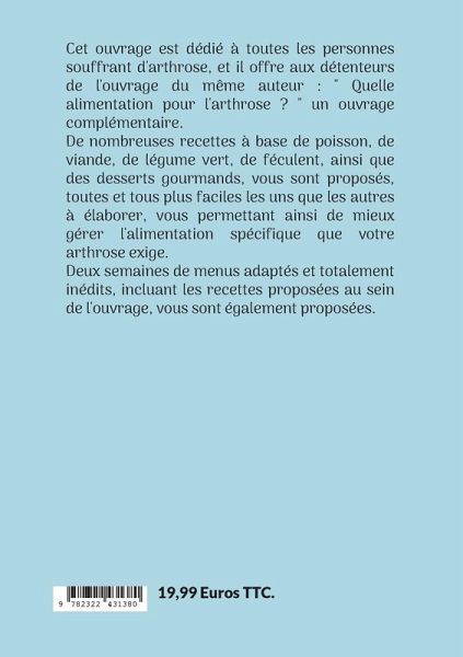 Cet ouvrage est dédié à toutes les personnes souffrant d'arthrose, et il offre aux détenteurs de l'ouvrage du même auteur : " Quelle alimentation pour l'arthrose ? " un ouvrage complémentaire.De nombreuses recettes à base de poisson, de viande, de légume vert, de féculent, ainsi que des desserts gourmands, vous sont proposés, toutes et tous plus faciles les uns que les autres à élaborer, vous permettant ainsi de mieux gérer l'alimentation spécifique que votre arthrose exige.Deux semaines de menus adaptés et totalement inédits, incluant les recettes proposées au sein de l'ouvrage, vous sont également proposées.