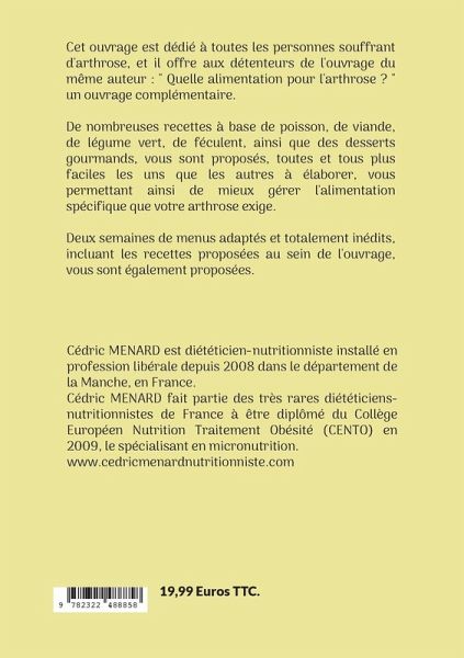 Cet ouvrage est dédié à toutes les personnes souffrant d'arthrose, et il offre aux détenteurs de l'ouvrage du même auteur : " Quelle alimentation pour l'arthrose ? " un ouvrage complémentaire.De nombreuses recettes à base de poisson, de viande, de légume vert, de féculent, ainsi que des desserts gourmands, vous sont proposés, toutes et tous plus faciles les uns que les autres à élaborer, vous permettant ainsi de mieux gérer l'alimentation spécifique que votre arthrose exige.Deux semaines de menus adaptés et totalement inédits, incluant les recettes proposées au sein de l'ouvrage, vous sont également proposées.