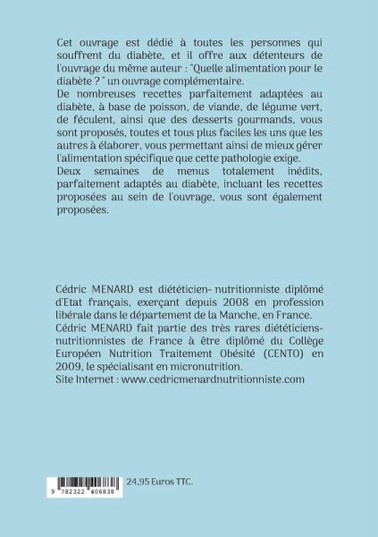 Cet ouvrage est dédié à toutes les personnes qui souffrent du diabète, et il offre aux détenteurs de l'ouvrage du même auteur : "Quelle alimentation pour le diabète ? " un ouvrage complémentaire.De nombreuses recettes parfaitement adaptées au diabète, à base de poisson, de viande, de légume vert, de féculent, ainsi que des desserts gourmands, vous sont proposés, toutes et tous plus faciles les uns que les autres à élaborer, vous permettant ainsi de mieux gérer l'alimentation spécifique que cette pathologie exige.Deux semaines de menus totalement inédits, parfaitement adaptés au diabète, incluant les recettes proposées au sein de l'ouvrage, vous sont également proposées.
