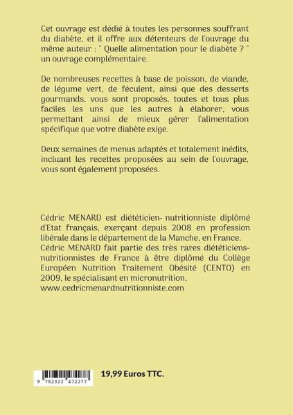 Cet ouvrage est dédié à toutes les personnes souffrant du diabète, et il offre aux détenteurs de l'ouvrage du même auteur : " Quelle alimentation pour le diabète ? " un ouvrage complémentaire.De nombreuses recettes à base de poisson, de viande, de légume vert, de féculent, ainsi que des desserts gourmands, vous sont proposés, toutes et tous plus faciles les uns que les autres à élaborer, vous permettant ainsi de mieux gérer l'alimentation spécifique que votre diabète exige.Deux semaines de menus adaptés et totalement inédits, incluant les recettes proposées au sein de l'ouvrage, vous sont également proposées.