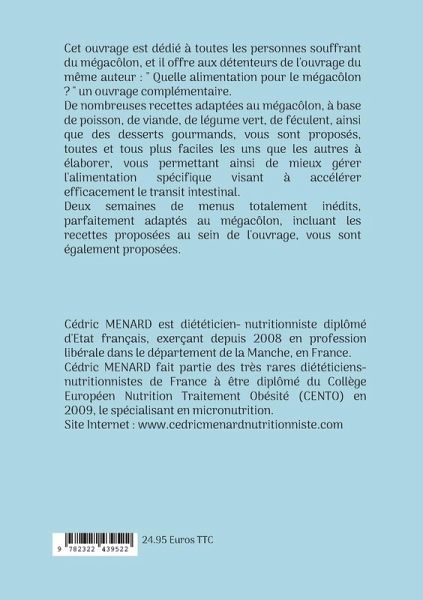 Cet ouvrage est dédié à toutes les personnes souffrant du mégacôlon, et il offre aux détenteurs de l'ouvrage du même auteur : " Quelle alimentation pour le mégacôlon ? " un ouvrage complémentaire.De nombreuses recettes adaptées au mégacôlon, à base de poisson, de viande, de légume vert, de féculent, ainsi que des desserts gourmands, vous sont proposés, toutes et tous plus faciles les uns que les autres à élaborer, vous permettant ainsi de mieux gérer l'alimentation spécifique visant à accélérer efficacement le transit intestinal.Deux semaines de menus totalement inédits, parfaitement adaptés au mégacôlon, incluant les recettes proposées au sein de l'ouvrage, vous sont également proposées.