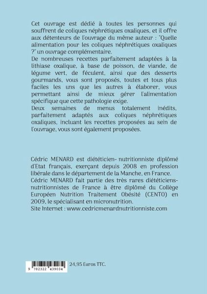 Cet ouvrage est dédié à toutes les personnes qui souffrent de coliques néphrétiques oxaliques, et il offre aux détenteurs de l'ouvrage du même auteur : " Quelle alimentation pour les coliques néphrétiques oxaliques ? " un ouvrage complémentaire.De nombreuses recettes parfaitement adaptées à la lithiase oxalique, à base de poisson, de viande, de légume vert, de féculent, ainsi que des desserts gourmands, vous sont proposés, toutes et tous plus faciles les uns que les autres à élaborer, vous permettant ainsi de mieux gérer l'alimentation spécifique que cette pathologie exige.Deux semaines de menus totalement inédits, parfaitement adaptés aux coliques néphrétiques oxaliques, incluant les recettes proposées au sein de l'ouvrage, vous sont également proposées.