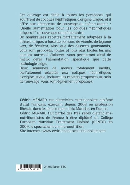 Cet ouvrage est dédié à toutes les personnes qui souffrent de coliques néphrétiques d'origine urique, et il offre aux détenteurs de l'ouvrage du même auteur : " Quelle alimentation pour les coliques néphrétiques uriques ? " un ouvrage complémentaire.De nombreuses recettes parfaitement adaptées à la lithiase urique, à base de poisson, de viande, de légume vert, de féculent, ainsi que des desserts gourmands, vous sont proposés, toutes et tous plus faciles les uns que les autres à élaborer, vous permettant ainsi de mieux gérer l'alimentation spécifique que cette pathologie exige.Deux semaines de menus totalement inédits, parfaitement adaptés aux coliques néphrétiques d'origine urique, incluant les recettes proposées au sein de l'ouvrage, vous sont également proposées.