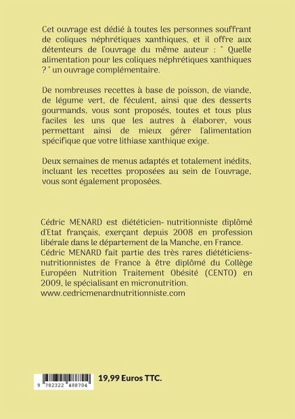 Cet ouvrage est dédié à toutes les personnes souffrant de coliques néphrétiques xanthiques, et il offre aux détenteurs de l'ouvrage du même auteur : " Quelle alimentation pour les coliques néphrétiques xanthiques ? " un ouvrage complémentaire.De nombreuses recettes à base de poisson, de viande, de légume vert, de féculent, ainsi que des desserts gourmands, vous sont proposés, toutes et tous plus faciles les uns que les autres à élaborer, vous permettant ainsi de mieux gérer l'alimentation spécifique que votre lithiase xanthique exige.Deux semaines de menus adaptés et totalement inédits, incluant les recettes proposées au sein de l'ouvrage, vous sont également proposées.