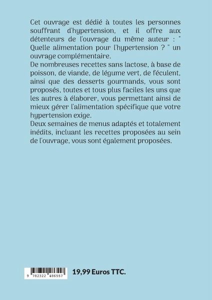 Cet ouvrage est dédié à toutes les personnes souffrant d'hypertension, et il offre aux détenteurs de l'ouvrage du même auteur : " Quelle alimentation pour l'hypertension ? " un ouvrage complémentaire.De nombreuses recettes sans lactose, à base de poisson, de viande, de légume vert, de féculent, ainsi que des desserts gourmands, vous sont proposés, toutes et tous plus faciles les uns que les autres à élaborer, vous permettant ainsi de mieux gérer l'alimentation spécifique que votre hypertension exige.Deux semaines de menus adaptés et totalement inédits, incluant les recettes proposées au sein de l'ouvrage, vous sont également proposées.