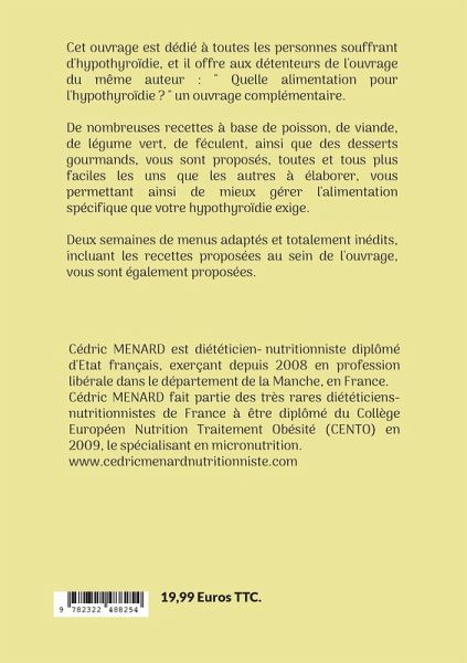 Cet ouvrage est dédié à toutes les personnes souffrant d'hypothyroïdie, et il offre aux détenteurs de l'ouvrage du même auteur : " Quelle alimentation pour l'hypothyroïdie ? " un ouvrage complémentaire.De nombreuses recettes à base de poisson, de viande, de légume vert, de féculent, ainsi que des desserts gourmands, vous sont proposés, toutes et tous plus faciles les uns que les autres à élaborer, vous permettant ainsi de mieux gérer l'alimentation spécifique que votre hypothyroïdie exige.Deux semaines de menus adaptés et totalement inédits, incluant les recettes proposées au sein de l'ouvrage, vous sont également proposées.