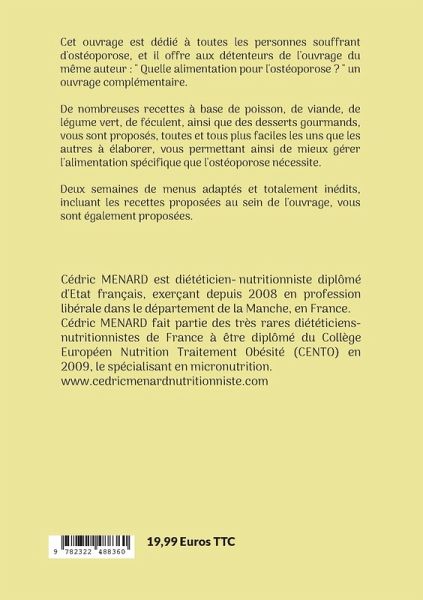 Cet ouvrage est dédié à toutes les personnes souffrant d'ostéoporose, et il offre aux détenteurs de l'ouvrage du même auteur : " Quelle alimentation pour l'ostéoporose ? " un ouvrage complémentaire.De nombreuses recettes à base de poisson, de viande, de légume vert, de féculent, ainsi que des desserts gourmands, vous sont proposés, toutes et tous plus faciles les uns que les autres à élaborer, vous permettant ainsi de mieux gérer l'alimentation spécifique que l'ostéoporose nécessite.Deux semaines de menus adaptés et totalement inédits, incluant les recettes proposées au sein de l'ouvrage, vous sont également proposées.