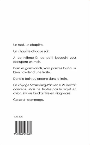 Un mot, un chapitre.Un chapitre chaque soir.A ce rythme-là, ce petit bouquin vous occupera un mois.Pour les gourmands, vous pourrez tout aussi bien l'avaler d'une traite.Dans le bain ou encore dans le train.Un voyage Strasbourg-Paris en TGV devrait convenir. Mais ne tentez pas le trajet en avion, il vous faudrait lire en diagonale.Ce serait dommage.