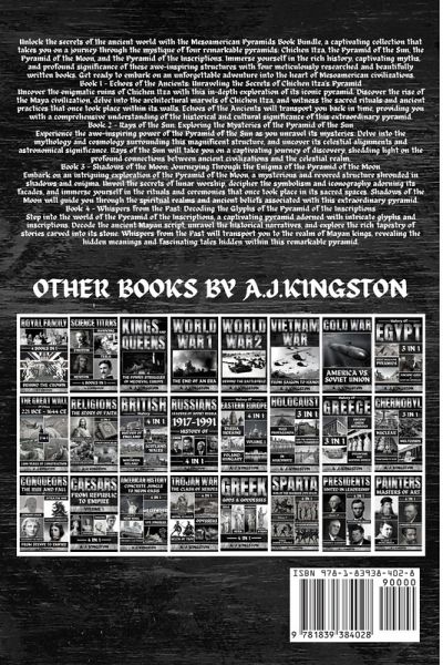 Unlock the secrets of the ancient world with the Mesoamerican Pyramids Book Bundle, a captivating collection that takes you on a journey through the mystique of four remarkable pyramids: Chichen Itza, the Pyramid of the Sun, the Pyramid of the Moon, and the Pyramid of the Inscriptions. Immerse yourself in the rich history, captivating myths, and profound significance of these awe-inspiring structures with four meticulously researched and beautifully written books. Get ready to embark on an unforgettable adventure into the heart of Mesoamerican civilizations. Book 1 - Echoes of the Ancients: Unraveling the Secrets of Chichen Itza's Pyramid Uncover the enigmatic ruins of Chichen Itza with this in-depth exploration of its iconic pyramid. Discover the rise of the Maya civilization, delve into the architectural marvels of Chichen Itza, and witness the sacred rituals and ancient practices that once took place within its walls. Echoes of the Ancients will transport you back in time, providing you with a comprehensive understanding of the historical and cultural significance of this extraordinary pyramid. Book 2 - Rays of the Sun: Exploring the Mysteries of the Pyramid of the Sun Experience the awe-inspiring power of the Pyramid of the Sun as you unravel its mysteries. Delve into the mythology and cosmology surrounding this magnificent structure, and uncover its celestial alignments and astronomical significance. Rays of the Sun will take you on a captivating journey of discovery, shedding light on the profound connections between ancient civilizations and the celestial realm. Book 3 - Shadows of the Moon: Journeying Through the Enigma of the Pyramid of the Moon Embark on an intriguing exploration of the Pyramid of the Moon, a mysterious and revered structure shrouded in shadows and enigma. Unveil the secrets of lunar worship, decipher the symbolism and iconography adorning its facades, and immerse yourself in the rituals and ceremonies that once took place in its sacred spaces. Shadows of the Moon will guide you through the spiritual realms and ancient beliefs associated with this extraordinary pyramid. Book 4 - Whispers from the Past: Decoding the Glyphs of the Pyramid of the Inscriptions Step into the world of the Pyramid of the Inscriptions, a captivating pyramid adorned with intricate glyphs and inscriptions. Decode the ancient Mayan script, unravel the historical narratives, and explore the rich tapestry of stories carved into its stone. Whispers from the Past will transport you to the realm of Mayan kings, revealing the hidden meanings and fascinating tales hidden within this remarkable pyramid. Why choose the Mesoamerican Pyramids Book Bundle? Comprehensive Coverage: Dive deep into the world of Mesoamerican pyramids with four meticulously researched and expertly written books that cover the most renowned pyramids of the region. Rich Cultural Context: Gain a comprehensive understanding of the historical, cultural, and spiritual significance of each pyramid, providing you with a holistic perspective on Mesoamerican civilizations. Captivating Narrative: Immerse yourself in the captivating storytelling and engaging narrative style that brings the history and mysteries of each pyramid to life. Expert Authorship: Written by renowned experts in Mesoamerican archaeology and history, ensuring the highest level of accuracy and expertise. Discover the secrets, unravel the mysteries, and unlock the profound wisdom of the Mesoamerican pyramids with the Mesoamerican Pyramids Book Bundle. Whether you are an avid history enthusiast, a lover of ancient civilizations, or simply seeking a captivating read, this book bundle will take you on an extraordinary journey through time and space. Order your bundle today and embark on an adventure that will leave you in awe of the magnificent achievements of our ancient ancestors.
