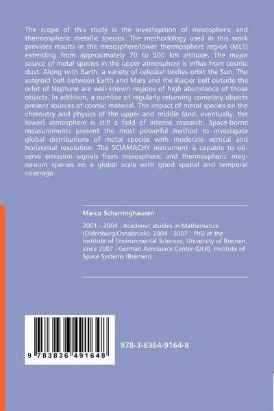 The scope of this study is the investigation of mesospheric and thermospheric metallic species. The methodology used in this work provides results in the mesosphere/lower thermosphere region (MLT) extending from approximately 70 to 500 km altitude. The major source of metal species in the upper atmosphere is influx from cosmic dust. Along with Earth, a variety of celestial bodies orbit the Sun. The asteroid belt between Earth and Mars and the Kuiper belt outside the orbit of Neptune are well-known regions of high abundance of those objects. In addition, a number of regularly returning cometary objects present sources of cosmic material. The impact of metal species on the chemistry and physics of the upper and middle (and, eventually, the lower) atmosphere is still a field of intense research. Space-borne measurements present the most powerful method to investigate global distributions of metal species with moderate vertical and horizontal resolution. The SCIAMACHY instrument is capable to observe emission signals from mesospheric and thermospheric magnesium species on a global scale with good spatial and temporal coverage.