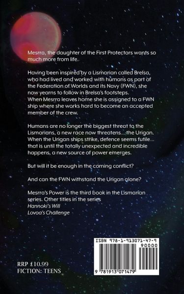 Mesrra, the daughter of the First Protectors wants so much more from life. Having been inspired by a Lismarian called Brelsa, who had lived and worked with humans as part of the Federation of Worlds and its Navy (FWN), she now yearns to follow in Brelsa’s footsteps. When Mesrra leaves home she is assigned to a FWN ship where she works hard to become an accepted member of the crew. Humans are no longer the biggest threat to the Lismarians, a new race now threatens… The Urigan. When the Urigan ships strike, defence seems futile… that is until the totally unexpected and incredible happens, a new source of power emerges. But will it be enough in the coming conflict? And can the FWN withstand the Urigan alone? Mesrra’s Power is the third book in the Lismarian series. Other titles in the series; Hannoki’s Will, Lovoa’s Challenge