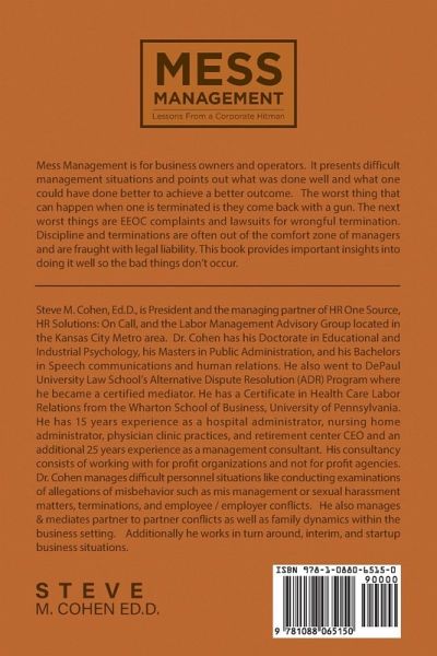 Mess Management is for business owners and operators. It presents difficult management situations and points out what was done well and what one could have done better to achieve a better outcome. The worst thing that can happen when one is terminated is they come back with a gun. The next worst things are EEOC complaints and lawsuits for wrongful termination. Discipline and terminations are often out of the comfort zone of managers and are fraught with legal liability. This book provides important insights into doing it well so the bad things don't occur.