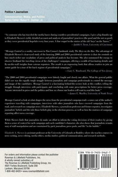 Message Control, a look at what shapes the news from the presidential campaign trail, comes out of the author's experience traveling with campaigns, interviews with other journalists who have covered campaigns from the road, and research on campaign news. Elizabeth Skewes, a journalism professor and former reporter, investigates journalists' beliefs and the role those beliefs play in the election process, as well as how the routines of campaign reporting affect news coverage.