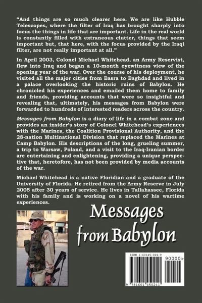 Messages from Babylon is a diary of life in a combat zone, and provides an insider's story of Colonel Whitehead's experiences with the Marines and the twenty eight nation Multinational Division that replaced the Marines at Camp Babylon.
