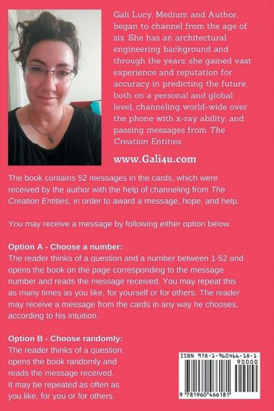 The book contains 52 messages in the cards, which were received by the author with the help of channeling from The Creation Entities, in order to award a message, hope, and help. You may receive a message by following either option below. Option A - Choose a number: The reader thinks of a question and a number between 1-52 and opens the book on the page corresponding to the message number and reads the message received. You may repeat this as many times as you like, for yourself or for others. The reader may receive a message from the cards in any way he chooses, according to his intuition. Option B - Choose randomly: The reader thinks of a question, opens the book randomly and reads the message received. It may be repeated as often as you like, for you or for others. Gali Lucy, Medium, Author, Singer, Composer, and Architecture Engineer, who channels with The Creation Entities since the age of six, using only her brain without additional tools. She is highly respected around the world for her astonishing accuracy in predicting the future, both on a personal and global level, using X-ray remote vision ability. She consults on a wide variety of topics around the world. All of her books were dictated to her through channeling. www.Gali4u.com Messages from the Mystical Cards is book #4 in the Gali Lucy Predictions Series: Book #1: Divine Creation Book #2: The Aquarius Age Book #3: The Future: Based on the Ages theory Book #4: Messages from the Mystical Cards Book #5: Lenormand Tarot Deck Meaning: A guidebook channeled through Anne-Marie Adelaide's spirit