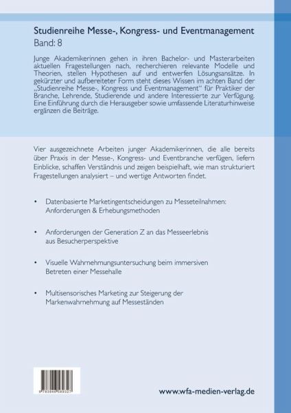 Junge Akademikerinnen gehen in ihren Bachelor- und Masterarbeiten aktuellen Fragestellungen nach, recherchieren relevante Modelle und Theorien, stellen Hypothesen auf und entwerfen Lösungsansätze. In gekürzter und aufbereiteter Form steht dieses Wissen im achten Band der "Studienreihe Messe-, Kongress und Eventmanagement" für Praktiker der Branche, Lehrende, Studierende und andere Interessierte zur Verfügung. Eine Einführung durch die Herausgeber sowie umfassende Literaturhinweise ergänzen die Beiträge.Vier ausgezeichnete Arbeiten junger Akademikerinnen, die alle bereits über Praxis in der Messe-, Kongress- und Eventbranche verfügen, liefern Einblicke, schaffen Verständnis und zeigen beispielhaft, wie man strukturiert Fragestellungen analysiert - und wertige Antworten findet.- Datenbasierte Marketingentscheidungen zu Messeteilnahmen: Anforderungen & Erhebungsmethoden- Anforderungen der Generation Z an das Messeerlebnis aus Besucherperspektive- Visuelle Wahrnehmungsuntersuchung beim immersiven Betreten einer Messehalle- Multisensorisches Marketing zur Steigerung der Markenwahrnehmung auf Messeständen