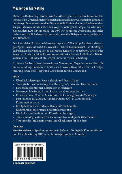 Dieser Leitfaden zeigt Ihnen, wie Sie Messenger-Dienste für Kommunikationsziele im Unternehmen erfolgreich einsetzen können. Sie erhalten gebündelt praxiserprobtes Wissen zu den Einsatzmöglichkeiten der verschiedenen Messenger. Erfahren Sie alles über den Weg zur richtigen Strategie, die relevanten Kennzahlen, ROI-Optimierung, die DSGVO-konforme Umsetzung und vieles mehr - anschaulich dargestellt anhand von realen Beispielen aus verschiedensten Branchen. Rund 90 Prozent der Internetnutzer in Deutschland verwenden Messenger, 81 Prozent davon nutzen WhatsApp. Die Anzahl der Nutzer von Messenger Apps wie WhatsApp, Facebook Messenger, Apple Business Chat & Co wächst seit Jahren kontinuierlich. Sie überflügelt global längst die Nutzung von Social-Media-Kanälen wie Facebook, Twitter oder Snapchat. Auch traditionelle Kommunikationskanäle wie E-Mai oder Telefon verlieren im Hinblick auf Messenger immer mehr an Bedeutung. In diesem Buch erhalten Unternehmen, Vereine und Organisationen Ideen für die Anwendung, Einblicke in Best Cases, konkrete Kennzahlen für die Erfolgsmessung sowie Tool-Tipps und Checklisten für die Umsetzung.
