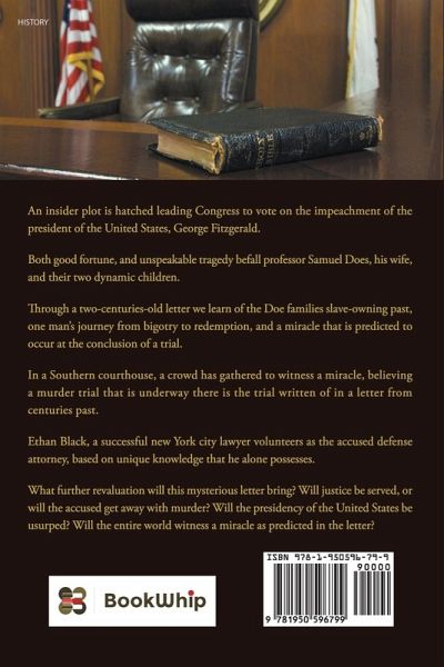 An insider plot is hatched leading Congress to vote on the impeachment of the president of the United States, George Fitzgerald. Both good fortune, and unspeakable tragedy befall professor Samuel Does, his wife, and their two dynamic children. Through a two-centuries-old letter we learn of the Doe families slave-owning past, one man's journey from bigotry to redemption, and a miracle that is predicted to occur at the conclusion of a trial. In a Southern courthouse, a crowd has gathered to witness a miracle, believing a murder trial that is underway there is the trial written of in a letter from centuries past. Ethan Black, a successful new York city lawyer volunteers as the accused defense attorney, based on unique knowledge that he alone possesses. What further revaluation will this mysterious letter bring? Will justice be served, or will the accused get away with murder? Will the presidency of the United States be usurped? Will the entire world witness a miracle as predicted in the letter?