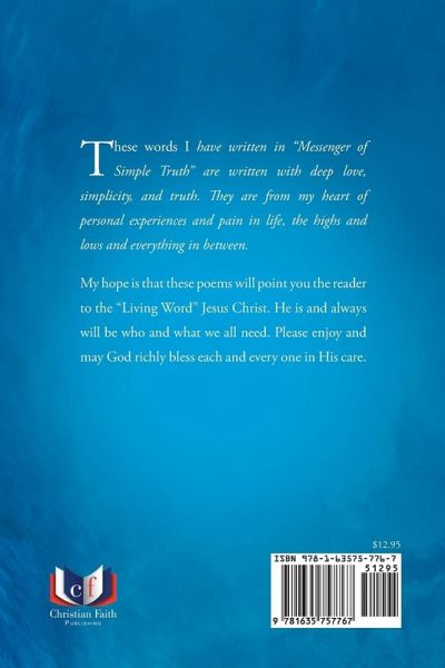 These words I have written in Messenger of Simple Truth are written with deep love, simplicity, and truth. They are from my heart of personal experiences and pain in life, the highs and lows and everything in between. My hope is that these poems will point you the reader to the Living Word Jesus Christ. He is and always will be who and what we all need. Please enjoy and may God richly bless each and every one in His care.