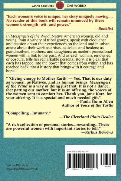 "Messengers of the Wind goes beyond the autobiographies of everyday women. These are women who have long been an invisible part of American culture. Their stories are haunting, frightening, encouraging, and courageous. . . . Katz is a faithful guide." --The Minnesota Daily In Messengers of the Wind, Native American women, old and young, from a variety of tribal groups, speak with eloquence and passion about their experience on the land and in urban areas; about their work as artists, activists, and healers; as grandmothers, mothers, and daughters; as modern women with a link to the past. And as each woman, renowned and obscure, tells her remarkable personal story, it is clear that each has tapped into the power that comes from within and has reached back into a history that brings with it courage and hope. " 'Giving energy to Mother Earth' -- Yes. That is our duty as women, as Natives, and as human beings. Messengers of the Wind is a way of doing just that. It is not a dance, feet patting our mother, but it is an offering, the voices of the women sent to comfort her. Thank-you, Jane Katz, for your offering. It is a special and much-needed gift." --Paula Gunn Allen Author of Voice of the Turtle "COMPELLING. . . INTIMATE." --The Cleveland Plain Dealer "A RICH COLLECTION OF PERSONAL STORIES. . .REWARDING. . . These are powerful women with important stories to tell." --Kirkus Reviews