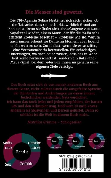 Die FBI-Agentin Selina Nesbit ist sich nicht sicher, ob die Tatsache, dass sie noch lebt, wirklich Grund zur Freude ist. Denn sie findet sich als Gefangene von Dante Napolitani wieder, einem Mann, der für die Mafia sehr effizient Probleme beseitigt - Probleme wie sie. Warum auch immer scheint sie Dante im Moment aber lebend mehr wert zu sein. Zumindest, wenn sie es schaffen, eine Vertrauensbasis herzustellen. Ein schwieriges Unterfangen, wo doch beide wissen, dass das in Wahrheit keine Partnerschaft ist, sondern ein Katz-und-Maus-Spiel, bei dem jeder von ihnen insgeheim seine eigenen Ziele verfolgt.Pressestimmen zur ReiheDas Buch setzt sich ab von manch anderem Buch aus diesem Genre, nicht zuletzt durch die ausgefeilte Sprache, die Feinheiten und Andeutungen zu einem immer bedrohlicher werdenden Netz verdichtet.Ich kann das Buch jeder und jedem empfehlen, der harten SM und den Krimiplot mag. Und wem es nach etwas anderem als Sklavinnen und Herren gelüstet. Denn so schlicht ist die Welt in diesem Buch nicht.-- Matthias Grimme - Schlagzeilen --Die Messerscharf-ReiheBand 1:VerführungBand 2:VertrauenBand 3:VerratBand 4:Vergeltung