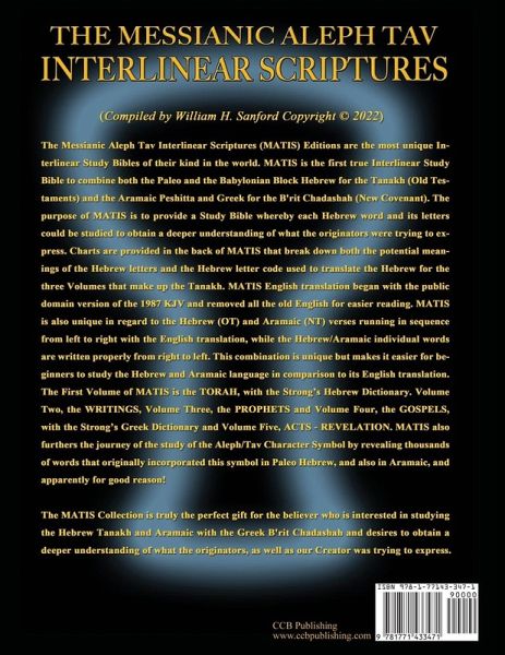 The Messianic Aleph Tav Interlinear Scriptures (MATIS-NT) Acts - Revelation, both Red Letter and Bold Black Editions, are the most unique Interlinear Study Bibles of the New Testament in the world. This work is a "Study Bible" and unique because it is the first large print, true interlinear edition of the New Testament to combine both Dr. John W. Etheridge's Eastern Aramaic Peshitta (22 books) and Dr. James Murdock's Peshitto (5 books) in both Aramaic and Hebrew font, with proper pronunciation, in comparison with the Greek English translation, word by word, all in true interlinear form. This is the first time the Aramaic Peshitta and Peshitto has ever been in true interlinear form, word by word. The Aramaic translation was provided by Lars Lindgren of Dukhrana.com website, and incorporates in the interlinear the pronunciation of the Aramaic, which is also unique and was created and provided by Lars Lindgren and used with his permission… all of which comes under copyright protection. The purpose of MATIS-NT is to provide a unique Study Bible whereby each Aramaic word and verse could be studied by comparing it to the Greek in an effort to obtain a deeper understanding of what the apostles were trying to express and the differences between the two English translations of the New Testament. MATIS-NT English translation began with the public domain version of the 1987 KJV and removed all the old English for easier reading from the interlinear portion. MATIS is also unique in regard to the Hebrew and Aramaic in the New Testament verses running in sequence from left to right with the English translation, while the Hebrew/Aramaic individual words are written properly from right to left. This combination is unique but makes it easier for beginners to study the Aramaic language in comparison to its English translation. The First Volume of MATIS is The TORAH, with the Strong's Hebrew Dictionary. Volume Two, The WRITINGS, Volume Three, The PROPHETS and Volume Four, MATIS-NT The GOSPELS, with the Strong's Greek Dictionary and Volume Five, Acts - Revelation has a limited Aramaic Lexical New Testament Dictionary. MATIS Study Bibles also furthers the journey of the study of the Aleph/Tav Character Symbol by revealing thousands of words that originally incorporated this symbol in Aramaic, and apparently for good reason! The entire collection of the 5 Volume set of MATIS Study Bibles is truly the perfect gift for the believer who is interested in studying the Biblical Hebrew Old Testament Tanakh and the Aramaic with the Greek B'rit Chadashah (New Testament) and desires to obtain a deeper understanding of what the originators, as well as our Creator was trying to express. About the Author: William H. Sanford is a licensed minister and has been studying and teaching the gospel message for over 40 years. William has over a dozen short videos about The Messianic Aleph Tav Scriptures (MATS) on YouTube, and he may be contacted through his website www.AlephTavScriptures.com or on Facebook at Aleph Tav Scriptures.