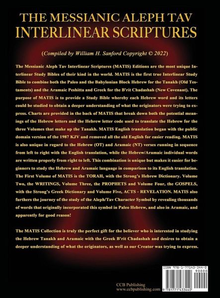 The Messianic Aleph Tav Interlinear Scriptures (MATIS-NT) Acts - Revelation, both Red Letter and Bold Black Editions, are the most unique Interlinear Study Bibles of the New Testament in the world. This work is a "Study Bible" and unique because it is the first large print, true interlinear edition of the New Testament to combine both Dr. John W. Etheridge's Eastern Aramaic Peshitta (22 books) and Dr. James Murdock's Peshitto (5 books) in both Aramaic and Hebrew font, with proper pronunciation, in comparison with the Greek English translation, word by word, all in true interlinear form. This is the first time the Aramaic Peshitta and Peshitto has ever been in true interlinear form, word by word. The Aramaic translation was provided by Lars Lindgren of Dukhrana.com website, and incorporates in the interlinear the pronunciation of the Aramaic, which is also unique and was created and provided by Lars Lindgren and used with his permission… all of which comes under copyright protection. The purpose of MATIS-NT is to provide a unique Study Bible whereby each Aramaic word and verse could be studied by comparing it to the Greek in an effort to obtain a deeper understanding of what the apostles were trying to express and the differences between the two English translations of the New Testament. MATIS-NT English translation began with the public domain version of the 1987 KJV and removed all the old English for easier reading from the interlinear portion. MATIS is also unique in regard to the Hebrew and Aramaic in the New Testament verses running in sequence from left to right with the English translation, while the Hebrew/Aramaic individual words are written properly from right to left. This combination is unique but makes it easier for beginners to study the Aramaic language in comparison to its English translation. The First Volume of MATIS is The TORAH, with the Strong's Hebrew Dictionary. Volume Two, The WRITINGS, Volume Three, The PROPHETS and Volume Four, MATIS-NT The GOSPELS, with the Strong's Greek Dictionary and Volume Five, Acts - Revelation has a limited Aramaic Lexical New Testament Dictionary. MATIS Study Bibles also furthers the journey of the study of the Aleph/Tav Character Symbol by revealing thousands of words that originally incorporated this symbol in Aramaic, and apparently for good reason! The entire collection of the 5 Volume set of MATIS Study Bibles is truly the perfect gift for the believer who is interested in studying the Biblical Hebrew Old Testament Tanakh and the Aramaic with the Greek B'rit Chadashah (New Testament) and desires to obtain a deeper understanding of what the originators, as well as our Creator was trying to express. About the Author: William H. Sanford is a licensed minister and has been studying and teaching the gospel message for over 40 years. William has over a dozen short videos about The Messianic Aleph Tav Scriptures (MATS) on YouTube, and he may be contacted through his website www.AlephTavScriptures.com or on Facebook at Aleph Tav Scriptures.