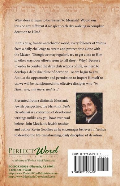 Presented from a distinctly Messianic Jewish perspective, the Messianic Daily Devotional is a collection of devotional writings unlike any you have ever read before. With selections ranging from gentle encouragement to inspiring exhortation, this unique and uplifting volume is an excellent tool for personal growth and discipleship in the Messiah Yeshua. Join Messianic Jewish teacher and author Kevin Geoffrey on the journey toward becoming effective disciples of the Master by developing a life-transforming, daily discipline of devotion.
