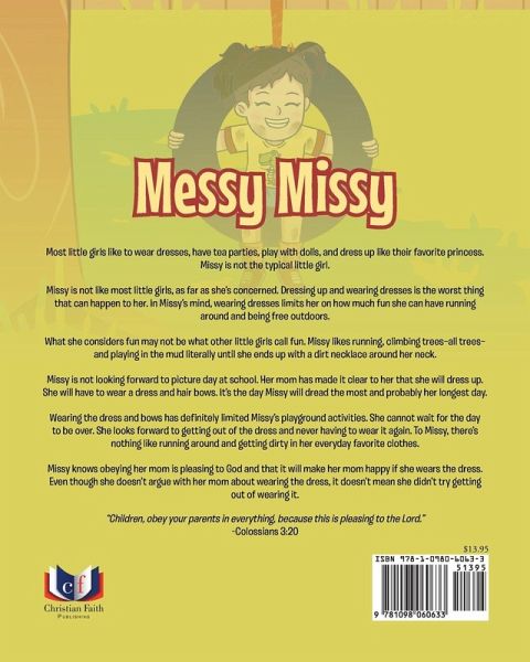 Most little girls like to wear dresses, have tea parties, play with dolls, and dress up like their favorite princess. Missy is not the typical little girl. Missy is not like most little girls, as far as she's concerned. Dressing up and wearing dresses is the worst thing that can happen to her. In Missy's mind, wearing dresses limits her on how much fun she can have running around and being free outdoors. What she considers fun may not be what other little girls call fun. Missy likes running, climbing trees-all trees-and playing in the mud literally until she ends up with a dirt necklace around her neck. Missy is not looking forward to picture day at school. Her mom has made it clear to her that she will dress up. She will have to wear a dress and hair bows. It's the day Missy will dread the most and probably her longest day. Wearing the dress and bows has definitely limited Missy's playground activities. She cannot wait for the day to be over. She looks forward to getting out of the dress and never having to wear it again. To Missy, there's nothing like running around and getting dirty in her everyday favorite clothes. Missy knows obeying her mom is pleasing to God and that it will make her mom happy if she wears the dress. Even though she doesn't argue with her mom about wearing the dress, it doesn't mean she didn't try getting out of wearing it. "Children, obey your parents in everything, because this is pleasing to the Lord." - Colossians 3:20