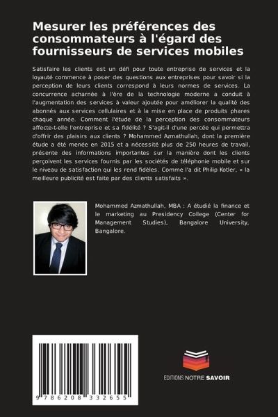 Satisfaire les clients est un défi pour toute entreprise de services et la loyauté commence à poser des questions aux entreprises pour savoir si la perception de leurs clients correspond à leurs normes de services. La concurrence acharnée à l'ère de la technologie moderne a conduit à l'augmentation des services à valeur ajoutée pour améliorer la qualité des abonnés aux services cellulaires et à la mise en place de produits phares chaque année. Comment l'étude de la perception des consommateurs affecte-t-elle l'entreprise et sa fidélité ? S'agit-il d'une percée qui permettra d'offrir des plaisirs aux clients ? Mohammed Azmathullah, dont la première étude a été menée en 2015 et a nécessité plus de 250 heures de travail, présente des informations importantes sur la manière dont les clients perçoivent les services fournis par les sociétés de téléphonie mobile et sur le niveau de satisfaction qui les rend fidèles. Comme l'a dit Philip Kotler, « la meilleure publicité est faite par des clients satisfaits ».