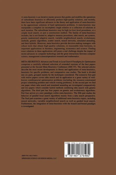 I: Tabu Search.- 1 Tabu Search Algorithms and Lower Bounds for the Resource-Constrained Project Scheduling Problem.- 2 Metaheuristic for the Vehicle Routing Problem with Time Windows.- 3 New Heuristic Algorithms for the Crew Scheduling Problem.- 4 Enhanced Continuous Tabu Search: An Algorithm for Optimizing Multiminima Functions.- 5 Local Search in Constraint Programming: Experiments with Tabu Search on the Vehicle Routing Problem.- 6 Tabu Search for Graph Coloring, T-colorings and Set T-colorings.- 7 Tabu Search with Critical Event Memory: An Enhanced Application for Binary Quadratic Programs.- 8 Actuator Selection for the Control of Multi-Frequency Noise in Aircraft Interiors.- 9 Neighborhood Search Algorithm for the Guillotine Non-Oriented Two-Dimensional Bin Packing Problem.- 10 Candidate List and Exploration Strategies for Solving 0/1 MIP Problems using a Pivot Neighborhood.- 11 Global and Local Moves in Tabu Search: A Real-Life Mail Collecting Application.- 12 Flow Line Scheduling by Tabu Search.- II: Combined and Hybrid Approaches.- 13 Using Lower Bounds in Minimum Span Frequency Assignment.- 14 A Hybrid Heuristic for Multiobjective Knapsack Problems.- 15 Hybrid Genetic Tabu Search for a Cyclic Scheduling Problem.- III: Genetic and Evolutionary Algorithms.- 16 Adaptive Genetic Algorithms: A Methodology for Dynamic Autoconfiguration of Genetic Search Algorithms.- 17 The Lavish Ordering Genetic Algorithm.- 18 Fitness Landscapes and Performance of Meta-Heuristics.- 19 A Network-Based Adaptive Evolutionary Algorithm for Constraint Satisfaction Problems.- IV: Ant Systems.- 20 Applying the Ant System to the Vehicle Routing Problem.- 21 Cooperative Intelligent Search Using Adaptive Memory Techniques.- 22 The Max-Min Ant System and Local Search for Combinatorial Optimization Problems.- V: Parallel Approaches.- 23 Towards an Evolutionary Method - Cooperating Multi-Thread Parallel Tabu Search Hybrid.- 24 Parallel Tabu Search for Large Optimization Problems.- 25 Sequential and Parallel Local Search Algorithms for Job Shop Scheduling.- 26 An Experimental Study of Systemic Behavior of Cooperative Search Algorithms.- VI: Further Meta-Heuristics.- 27 A Hopfield-Tank Neural Network Model for the Generalized Traveling Salesman Problem.- 28 Generalized Cybernetic Optimization: Solving Continuous Variable Problems.- 29 Solving the Progressive Party Problem by Local Search.- 30 An Introduction to Variable Neighborhood Search.- 31 A Variable Depth Search Algorithm for the Generalized Assignment Problem.- 32 Guided Local Search for the Vehicle Routing Problem with Time Windows.- 33 Memory Adaptive Reasoning & Greedy Assignment Techniques for the Capacitated Minimum Spanning Tree Problem.- 34 A Chunking Based Selection Strategy for Integrating Meta-Heuristics with Branch and Bound.