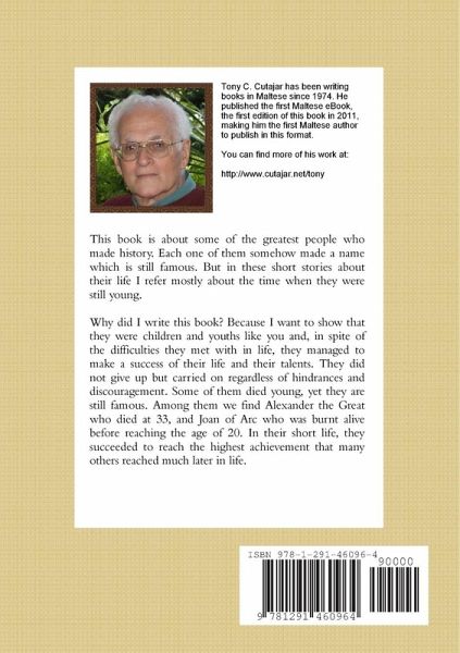 This book is about some of the greatest people who made history. Each one of them somehow made a name which is still famous. But in these short stories about their life I refer mostly about the time when they were still young. Why? Because I want to show that they were children and youths like you and, in spite of the difficulties they met with in life, they managed to make a success of their life and their talents. They did not give up but carried on regardless of hindrances and discouragement. Some of them died young, yet they are still famous. Among them we find Alexander the Great who died at 33, and Joan of Arc who was burnt alive before reaching the age of 20. In their short life, they succeeded to reach the highest achievement that many others reached much later in life.