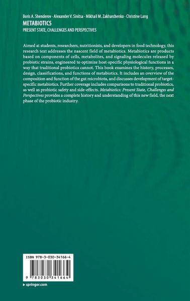 Ch 1: Introduction.- Ch 2: The composition and functions of the human gut symbiotic microbiota.- Ch 3: Contemporary views on biotechnological potential of symbiotic microorganisms.- Ch 4: The digestive function of human gut microbiota.- Ch 5: Metabolic relationship between the host and its gut microbiota.- Ch 6: Factors and agents that modify the composition and functions of symbiotic microbiota, diagnostic methods for microecological imbalance and its consequences.- Ch 7: Contemporary microecological strategies of gut microbiota modulating for human health preservation, restoration and improvement.- Ch 8: Molecular language of symbiotic gut microorganisms.- Ch 9: Drawbacks and negative consequences of traditional probiotics based on live microorganisms.- Ch 10: Metabiotics, New stage of the probiotic concept development.- Ch 11: Methods and techniques used for obtaining and identifying of microbial low molecular weight cellular compounds, metabolites and signaling molecules.- Ch 12: Classification of metabiotics and their brief description.- Ch 13: Some of the best-known metabiotics on the market of microecological market.- Ch 14: Cellular metabiotics and Metabolite metabiotics.- Ch 15: Prospects in the field of intended-use metabiotics creation.- Ch 16: Some new targets and approaches to the construction of intended-use metabiotics.- Ch 17: Conclusion.