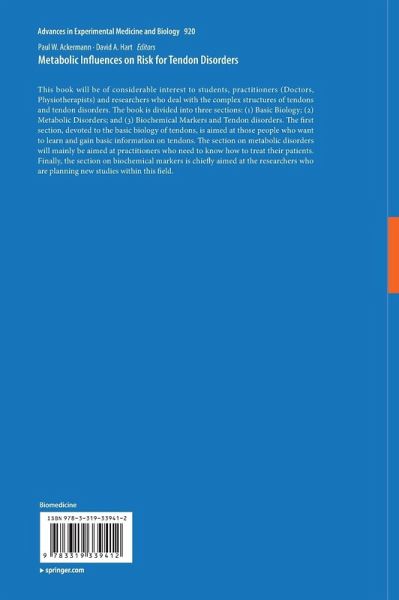 Preface.- Part I Basic Biology and Anatomy.- Chapter 1. Tendon structure and composition - Thorpe, Screen.- Chapter 2. Blood supply - Kubu.- Chapter 3. Tendon Innervation - Karolinska/ Calgary.- Chapter 4. Tendon stem cells - J. Wang.- Chapter 5. Informing Stem Cell-Based Tendon Tissue Engineering Approaches with Embryonic Tendon Development - C. Kuo.- Chapter 6. Tendon cell signaling - A. Banes.- Chapter 7. Methods of assessing human tendon metabolism. - Kjaer, Magnusson.- Part II Tendon Disorders Associated with Altered Metabolism and Metabolic Disorders.- Chapter 8. Towards an understanding of the genetics of tendinopathy - September A.- Chapter 9. Tendons involvement in Congenital Metabolic metabolic disorders - Andia I.- Chapter 10. Hyperuricemia - Isabel Andia, Abate .- Chapter 11. Influence of Thyroid hormones on tendon homeostasis - Francesco Oliva.- Chapter 12. Sex hormones and tendon - Mette Hansen, M. Kjaer.- Chapter 13. Tendon Homeostasis in Hypercholesterolemia - Louis Soslowsky.- Chapter 14. How Obesity affects tendons - Michele Abate.- Chapter 15.- Does diabetes affect Tendon healing - A. Ahmed.- Chapter 16. Metalloproteinase changes in diabetes - Bento.- Chapter 17. How high glucose levels affect tendon homeostasis - Snedeker.- Chapter 18. Rehabilitation of tendon problems in patients with diabetes mellitus - A. Scott.- Chapter 19. Inflammation in tendon disorders - C. Speed.- Chapter 20. Deep venous thrombosis and tendon healing - E. Arverud.- Chapter 21. Drug induced tendon disorders - K. Knobloch.- Chapter 22. Glucocorticoid effects on tendon metabolism - Dean and Carr.- Chapter 23. Influence of Ageing on tendon homeostasis - Helen Birch, Clegg PD.- Part III Novel therapies that may affect tendon metabolism.- Chapter 24. Does platelet-rich plasma increase tendon metabolism? - de Vos.- Chapter 25.- Can shockwave therapy improve tendon metabolism? - Zwerver. Chapter 26.-Do dietary factors influence tendon metabolism? A. Scott.- Part IV Summary. - Chapter 27. General overview and summary of concepts - P. Ackermann, Dave Hart.