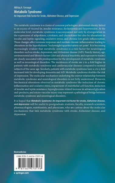 Metabolic syndrome as an important risk factor for stroke, Alzheimer disease, and depression presents readers with cutting edge and comprehensive information on relationship among metabolic syndrome, stroke, Alzheimer disease, and depression. It is hoped that this monograph will be useful to postgraduate students, faculty, research scientists, pharmacologists, nutritionists, and physicians, who are curious about the molecular mechanisms that link metabolic syndrome with stroke, Alzheimer disease, and depression.
