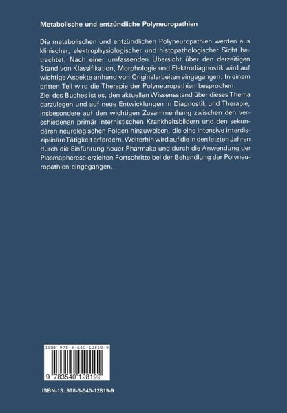 Die Polyneuropathien metabolischer und entzündlicher Ätiologie, Einführung..- Epidemiologie der metabolischen und entzundlichen Polyneuropathien.- Pathophysiology of Metabolic Neuropathies and Neuronopathies Including Amyotrophic Lateral Sclerosis.- Typen und Differenzierung der metabolischen Polyneuropathien.- Metabolische Neuropathien: Elektrophysiologie.- Muskelatrophie bei chronischem Alkoholabusus: Vergleichende histochemische und biochemische Untersuchungen.- Diagnostische Relevanz von laborchemischen Hepatopathiehinweisen bei alkoholischen Polyneuropathien.- Ungewöhnliche Malnutritions-Polyneuropathie.- Subklinische Polyneuropathien bei Anorexia nervosa.- Folsäureuntersuchungen bei Neuropathien.- Die Einordnung der viszeralen Neuropathie in die symmetrischen Polyneuropathien beim Diabetes mellitus.- Reversible Funktionsstörung bei der urämischen Polyneuropathie: Nachweis durch die Refraktärperiode.- Neuromuskulare Reaktion auf Paarstimulation zur Differenzierung axonaler und demyelinisierender Neuropathien.- Neue elektromyographische Aspekte für die Differentialdiagnose der Polyneuropathien.- Verlaufsbeobachtungen in einer Familie mit hereditärer Amyloid-polyneuropathie.- Polyneuropathie bei hereditärer Amyloidose.- Neurologische, elektromyographische und histologische Befunde bei der A-ß-Lipoproteinämie (Bassen-Kornzweig-Syndrom).- Elektroneurographische Befunde bei Morbus Refsum.- Entzündliche Polyneuropathien - Klinik und Differentialdiagnose.- Immunologische Aspekte bei entzündlichen Neuropathien.- Pathologie der entzündlichen Polyneuropathien.- Elektrophysiologie der entzundlichen Polyneuropathien.- Rezidivierende und chronische Polyneuritiden (Erfahrungen mit 24 Fällen und Vergleich mit subakuten Formen).- Chronische Polyneuritis -klinische und bioptische Beobachtungen.- Neuroradikulomyelitis viraler Genese.- Untersuchungen zur Verlauf schwerer idiopathischer Polyneuropathien. Katamnestische Studien.- Zur Prognose des Guillain-Barré-Syndroms anhand elektro-neurographischer und klinischer Untersuchungen.- Guillain-Barré-Syndrom bei Clostridium-botulinum-Typ-C-Toxikoinfektion.- Beobachtung einer Polyneuritis mit Lähmungsbild, vergleichbar mit dem Locked-in-Syndrom.- Die sensible Polyneuropathie bei akuter Ophthalmoplegie und Ataxie (Fisher-Syndrom).- Polyneuropathie und Vorderhorndegeneration bei malignen Lymphomen.- Diagnostik und Verlauf von gefäßentzündlich bedingten Poly-neuropathien.- Periphere Neuropathie bei progressiver systemischer Sklerodermie (PSS).- Lepra-Polyneuritis.- Tuberkuloide Lepra.- Zur Frage der luischen Polyneuritis.- Postinfektiose Polyneuritis bei akuter erworbener Toxoplasmose.- Reinnervationsmechanismen am Modell des sensiblen Nerves.- Mikrochirurgie der peripheren Nerven.- Möglichkeiten medikamentöser Therapie.- Pharmacological Aspects of Experimental Peripheral Neuropathy.- Zur Therapie peripherer Neuropathien mit Gangliosiden: Eine Übersicht.- Die Behandlung der diabetischen Neuropathien mit Gangliosiden:Eine multizentrische Doppelblind-cross-over-Studie bei 140Patienten.- Klinische und elektrophysiologische Befunde zur Therapie diabetischer Polyneuropathien mit einem eiweißfreien Hämodialysat (Actovegin).- Gemischte Kryoglobulinämie: Therapie und elektrophysiologische Verlaufsbeobachtung.- Intensivbehandlung lebensbedrohlicher Polyneuritiden.- Plasmaaustauschbehandlung des Guillain-Barré-Syndroms.- Plasmapherese, Immunsuppression und hochdosierte IgG-Gaben bei chronischem Guillain-Barré-Syndrom und Antikorpern gegen peripheres Nervengewebe.- ZurPlasmapherese bei schwersten Formen der akuten Polyneuritis.- Schlußwort.