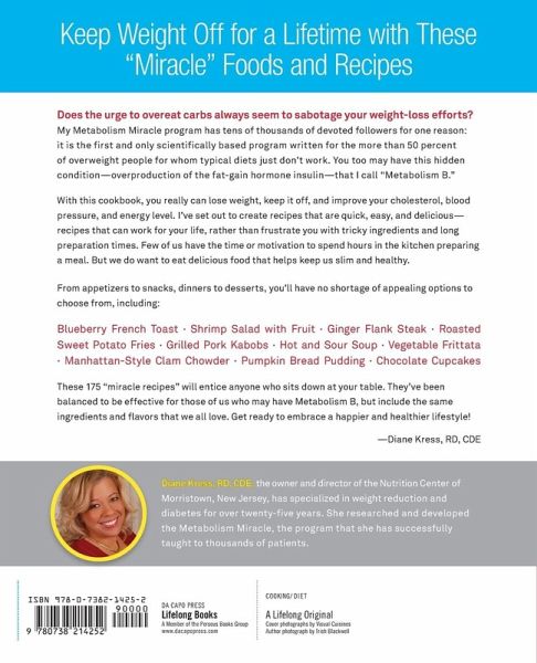Does a strong urge to fill up on carbs sabotage your weight-loss efforts? Are you often tired and irritable, and is there a roll of fat around your middle? Now it's easier than ever to eat great and lose weight. The Metabolism Miracle Cookbook includes more than 150 quick-and-easy, carb-controlled recipes and menus tailored to each step of The Metabolism Miracle diet plan. Nearly half of all Americans have Metabolism B" and unknowingly overproduce the fat-gain hormone insulin. These recipes are specifically formulated to help people with this hidden condition lose weight, lower blood pressure and cholesterol, decrease risk of or improve control over diabetes, and increase their energy. From appetizers, soups, and salads to vegetables, entrées, and desserts ideal for family meals, readers will have no shortage of delicious options. Vegetarian and gluten-free choices are also included.