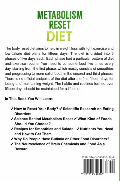 The body reset diet aims to help in weight loss with light exercise and low-calorie diet plans for fifteen days. The diet is divided into 3 phases of five days each. Each phase had a particular pattern of diet and exercise routine. You need to consume food five times every day, starting from the first phase, which mostly consists of smoothies and progressing to more solid foods in the second and third phases. There is no official endpoint of the diet after the first fifteen days for losing and maintaining weight. The habits and routines formed over fifteen days should be maintained for a lifetime. In This Book You Will Learn: ¿ How to Reset Your Body? ¿ Science Behind Metabolism Reset ¿ Recipes for Smoothies and Salads ¿ What Kind of Foods Should You Choose? ¿ Nutrients You Need and How to Get Them ¿ Why Do People Eat Emotionally? ¿ Scientific Research on Eating Disorders and Why They Exist ¿ Why Do People Have Bulimia or Other Food Disorders? ¿ The Neuroscience of Brain Chemicals and Food As a Reward Delicious Recipes For Metabolim Increase Include: ¿ Green Smoothie ¿ Strawberry Banana Smoothie ¿ Salmon Citrus Salad ¿ Quinoa Salad ¿ Herb and Goat Cheese Omelet ¿ Mediterranean Cod ¿ Grilled Chicken and Veggies ¿ Stuffed Peppers ¿ Brussels Sprouts With Honey Mustard Chicken ¿ Quinoa Stuffed Chicken ¿ Kale and Sweet Potato Frittata ¿ Walnut, Ginger, and Pineapple Oatmeal ¿ One-Pot Chicken Soup ¿ Chocolate Pomegranate Truffles And Much More! Pick up your copy of the book right now by clicking the BUY NOW button at the top of this page!