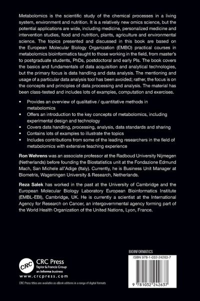 Metabolomics is the scientific study of the chemical processes in a living system, environment and nutrition. It is a relatively new omics science, but the potential applications are wide, including medicine, personalized medicine and intervention studies, food and nutrition, plants, agriculture and environmental science. The topics presented and discussed in this book are based on the European Molecular Biology Organization (EMBO) practical courses in metabolomics bioinformatics taught to those working in the field, from masters to postgraduate students, PhDs, postdoctoral and early PIs. The book covers the basics and fundamentals of data acquisition and analytical technologies, but the primary focus is data handling and data analysis. The mentioning and usage of a particular data analysis tool has been avoided; rather, the focus is on the concepts and principles of data processing and analysis. The material has been class-tested and includes lots of examples, computing and exercises. Key Features: Provides an overview of qualitative /quantitative methods in metabolomics Offers an introduction to the key concepts of metabolomics, including experimental design and technology Covers data handling, processing, analysis, data standards and sharing Contains lots of examples to illustrate the topics Includes contributions from some of the leading researchers in the field of metabolomics with extensive teaching experiences