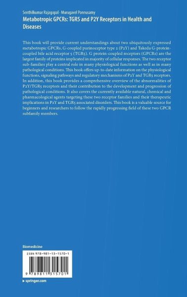 This book will provide current understandings about two ubiquitously expressed metabotropic GPCRs, G-coupled purinoreceptor type 2 (P2Y) and Takeda G-protein-coupled bile acid receptor 5 (TGR5). G protein coupled receptors (GPCRs) are the largest family of proteins implicated in majority of cellular responses. The two receptor sub-families play a central role in many physiological functions as well as in many pathological conditions. This book offers up-to-date information on the physiological functions, signaling pathways and regulatory mechanisms of P2Y and TGR5 receptors. In addition, this book provides a comprehensive overview about the abnormalities of P2Y/TGR5 receptors and their contribution in the development and progression of pathological conditions. It also covers the currently available natural, chemical and pharmacological agents targeting these two receptor families and their therapeutic implications in P2Y and TGR5 associated disorders. This book is a valuable sourcefor beginners and researchers to follow the rapidly progressing field of these two GPCR subfamily members.