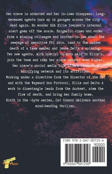 Her niece is abducted and her in-laws disappear. Long-deceased agents turn up in garages across the city - dead again. No wonder SSA Ellie Iverson's internal alert goes off the scale. Enigmatic clues and codes from a missing colleague and brother-in-law about the seepage of sensitive FBI data, lead to the sudden death of a team member and leave Delta A spinning. Two new agents, with special talents akin to Ellie's, join the team and ramp her alarm sensors even higher. Her niece's social media life offers clues to a horrifying network and its activities. Working under a directive from the Director of the FBI and with the Wayward Son Protocol, Ellie and Delta A work to disentangle leads from the darknet, stem the flow of death, and bring her family home. Ninth in the -byte series, Cat Connor delivers another mind-bending thriller.