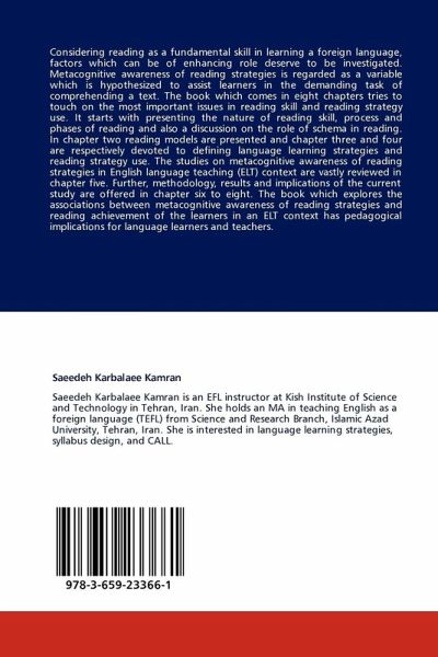 Considering reading as a fundamental skill in learning a foreign language, factors which can be of enhancing role deserve to be investigated. Metacognitive awareness of reading strategies is regarded as a variable which is hypothesized to assist learners in the demanding task of comprehending a text. The book which comes in eight chapters tries to touch on the most important issues in reading skill and reading strategy use. It starts with presenting the nature of reading skill, process and phases of reading and also a discussion on the role of schema in reading. In chapter two reading models are presented and chapter three and four are respectively devoted to defining language learning strategies and reading strategy use. The studies on metacognitive awareness of reading strategies in English language teaching (ELT) context are vastly reviewed in chapter five. Further, methodology, results and implications of the current study are offered in chapter six to eight. The book which explores the associations between metacognitive awareness of reading strategies and reading achievement of the learners in an ELT context has pedagogical implications for language learners and teachers.