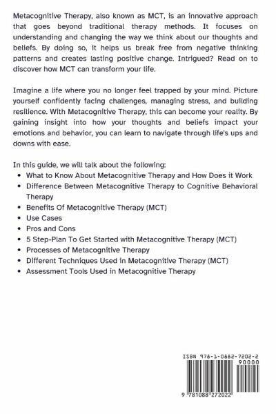 Are you tired of feeling overwhelmed by your thoughts and emotions? Do you yearn for a way to take control of your mind and find inner peace? This comprehensive guide to Metacognitive Therapy will equip you with the tools and techniques needed to tap into the incredible power of your mind.Metacognitive Therapy, also known as MCT, is an innovative approach that goes beyond traditional therapy methods. It focuses on understanding and changing the way we think about our thoughts and beliefs. By doing so, it helps us break free from negative thinking patterns and creates lasting positive change. Intrigued? Read on to discover how MCT can transform your life.Imagine a life where you no longer feel trapped by your mind. Picture yourself confidently facing challenges, managing stress, and building resilience. With Metacognitive Therapy, this can become your reality. By gaining insight into how your thoughts and beliefs impact your emotions and behavior, you can learn to navigate through life's ups and downs with ease.In this guide, we will talk about the following: What to Know About Metacognitive Therapy and How Does it Work Difference Between Metacognitive Therapy to Cognitive Behavioral Therapy Benefits Of Metacognitive Therapy (MCT) Use Cases Pros and Cons 5 Step-Plan To Get Started with Metacognitive Therapy (MCT) Processes of Metacognitive Therapy Different Techniques Used in Metacognitive Therapy (MCT) Assessment Tools Used in Metacognitive Therapy Ready to take control of your mind and unlock its potential? Dive into our comprehensive guide on Metacognitive Therapy to learn powerful techniques and strategies for transforming your thinking. Discover how to break free from negative thought patterns, cultivate mindfulness, and reframe your beliefs. Don't wait-start your journey to a more empowered and fulfilling life today!