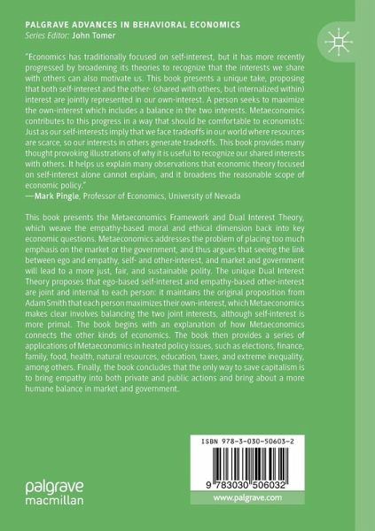 This book presents the Metaeconomics Framework and Dual Interest Theory, which weave the empathy-based moral and ethical dimension back into key economic questions. Metaeconomics addresses the problem of placing too much emphasis on the market or the government, and thus argues that seeing the link between ego and empathy, self- and other-interest, and market and government will lead to a more just, fair, and sustainable polity. The unique Dual Interest Theory proposes that ego-based self-interest and empathy-based other-interest are joint and internal to each person: it maintains the original proposition from Adam Smith that each person maximizes their own-interest, which Metaeconomics makes clear involves balancing the two joint interests, although self-interest is more primal. The book begins with an explanation of how Metaeconomics connects the other kinds of economics. The book then provides a series of applications of Metaeconomics in heated policy issues, such as elections, finance, family, food, health, natural resources, education, taxes, and extreme inequality, among others. Finally, the book concludes that the only way to save capitalism is to bring empathy into both private and public actions and bring about a more humane balance in market and government.