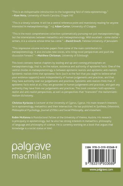 Introduction, Christos Kyriacou and Robin McKenna.- Part I: Epistemic Realism.- 1. The Core Expressivist Manoeuvre, Terence Cuneo.- 2. Epistemic Reductionism and the Moral-Epistemic Disparity, Chris Heathwood.- 3. From Moral Fixed Points to Epistemic Fixed Points, Christos Kyriacou.- 4. Normative Reasons for Mentalism, Eva Schmidt.- 5. Epistemic Consequentialism: Haters Gonna Hate, Nathaniel Sharadin.- Part II: Epistemic Anti-Realism.- 6. Knowledge, Reasons, and Errors about Error Theory, Charles Côté-Bouchard and Clayton Littlejohn.- 7. Constitutivism about Epistemic Normativity, Christopher Cowie and Alexander Greenberg.- 8. Correctness and Goodness, Allan Hazlett.- 9. The Genealogy of Relativism and Absolutism, Martin Kusch and Robin McKenna.- 10. Reasons Primitivism and Epistemic Expressivism, Teemu Toppinen.- Part III: Beyond the Realism/Anti-Realism Divide.- 11. What Anti-Realism about Hinges Could Possibly Be, Annalisa Coliva.- 12. Epistemic Schmagency?, A.K. Flowerree.