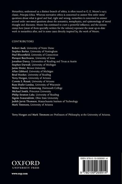 Metaethics, understood as a distinct branch of ethics, is often traced to G. E. Moore's 1903 classic, Principia Ethica. Whereas normative ethics is concerned to answer first-order moral questions about what is good and bad, right and wrong, metaethics is concerned to answer second-order non-moral questions about the semantics, metaphysics, and epistemology of moral thought and discourse. Moore has continued to exert a powerful influence, and the sixteen essays here (most of them specially written for the volume) represent the most up-to-date work in metaethics after, and in some cases directly inspired by, the work of Moore. Contributors include Robert Audi, Stephen Barker, Paul Bloomfield, Panayot Butchvarvov, Jonathan Dancy, Stephen Darwall, Jamie Dreier, Allan Gibbard, Brad Hooker, Terry Horgan, Connie Rosati, Russ Shafer-Landau, Walter Sinnott-Armstrong, Michael Smith, Philip Stratton-Lake, Sigrun Svavarsdottir, Mark Timmons, and Judith Jarvis Thomson.