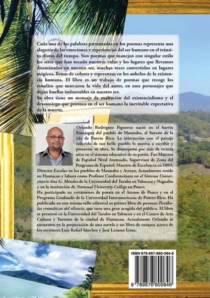 Cada una de las palabras presentadas en los poemas representa una alegoría de las emociones y experiencias del ser humano en el tránsito diario del tiempo. Son poemas que manejan con singular estilo los seres que han tocado nuestras vidas y los lugares que llevamos diseminados en nuestro ser, muchas veces convertidos en lugares mágicos, llenos de colores y esperanzas en los anhelos de la existencia humana. El libro es un trabajo de poemas que recoge los estudios que marcaron la vida del autor, en esos personajes que dejan huellas imborrables en nuestro ser. Su obra tiene un mensaje de exaltación del existencialismo y el desasosiego que provoca en el ser humano la inevitable expectativa de la muerte. Orlando Rodríguez Figueroa nació en el barrio Emajagua del pueblo de Maunabo, al Sureste de la isla de Puerto Rico. La interacción con el paisaje colorido de tan bello pueblo le motiva a escribir y presentar su obra. Se desempeñó por más de treinta años en el sistema educativo de su patria. Fue Maestro de Español Nivel Avanzado, Supervisor de Zona del Programa de Español, Maestro de Excelencia en 1995, Director Escolar en los pueblos de Maunabo y Arroyo. Actualmente reside en Humacao y labora como Profesor Conferenciante en el Sistema Universitario Ana G. Méndez de la Universidad del Turabo en Yabucoa y Naguabo y en la institución de National University College en Ponce. Ha participado en certámenes de poesía en el Ateneo de Ponce y en el Programa Graduado de la Universidad Interamericana de Puerto Rico. Ha publicado en este mismo sello editorial su primer libro de poemas: Parábolas cromáticas del silencio, que tuvo una gran acogida del público. El libro se presentó en la Universidad del Turabo en Yabucoa y en el Centro de Arte Cultura y Turismo de la ciudad de Humacao. Actualmente Orlando se encuentra en la preparación de una novela y un libro de ensayos acerca de los escritores Luis Rafael Sánchez y José Lezama Lima.
