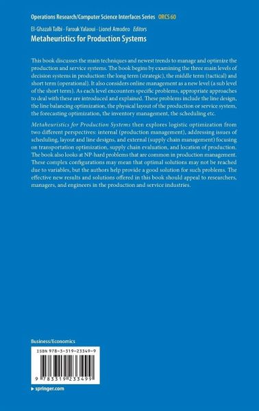 A Literature Survey on Metaheuristics in Production Systems.- Solving Unidirectional Flow Path Design Problems Using Metaheuristics.- Iterated Great Deluge for the Dynamic Facility Layout Problem.- Optimization Approaches for Multi-Level Assembly Systems Under Stochastic Lead Times.- An Adapted NSGA-H Algorithm for a Reconfigurable Manufacturing System (RMS) Design Under Machines Reliability Constraints.- Levy Strategy Based Metaheuristic for Smart Grid.- Minimising Safety Stock and Lead Time in Production Systems Under Guaranteed-Service Time Models by Swarm Intelligence.- Tabu Search Approaches for Two Car Sequencing Problems with Smoothing Constraints.- Investigations on Performance Evaluation of Scheduling Heuristics and Metaheuristics in a Parallel machine Environment.- Scheduling Complex Manufacturing Systems Using a Genetic Algorithm.- An Efficient Heuristic to Minimize the Total Tardiness in the Parallel Machines Scheduling Problem.- Integrated Planning and Scheduling with Dynamic Analysis and Control of Service Level and Costs.- Meta-heuristics Approaches for the Flexible Job Shop Scheduling Problem.- Fuzzy Modeling of Single Machine Scheduling Problems Including the Learning Effect.